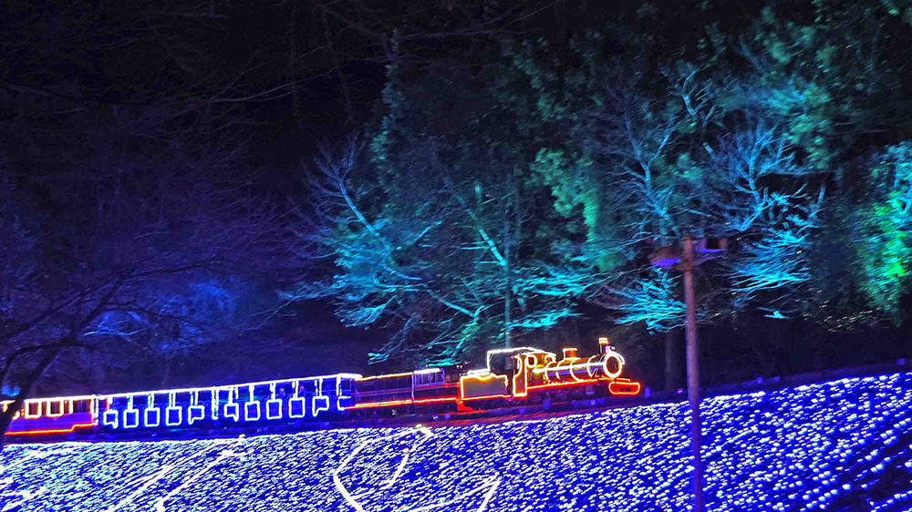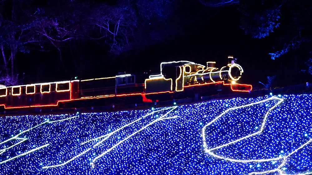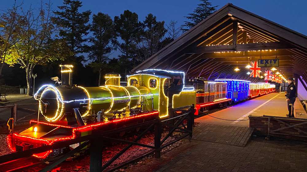 光るSL機関車から眺めるイルミネーションは、期待感を高める特別な体験となります。また、幻想的に輝き走る姿は、まるで物語の中に入り込んだかのよう。虹の郷でしか味わうことのできない光の旅を体験できます。ワンちゃんとイルミを楽しめる特別車両も。 ※上り下りとも30分ごとの運行です。