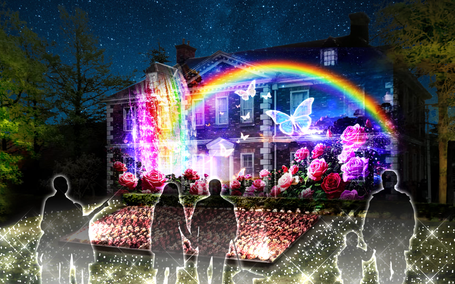 イギリス村の洋館に映し出されるプロジェクションマッピング。映像が訪れた方々を幻想的な光の世界に誘います。